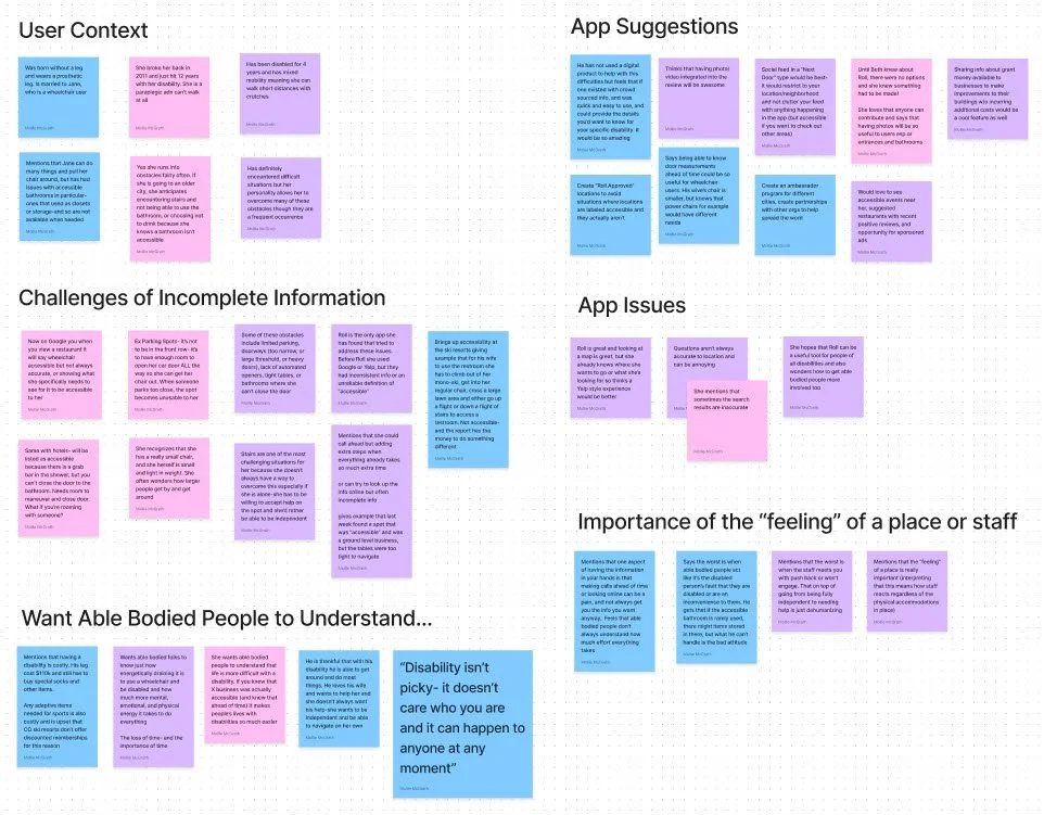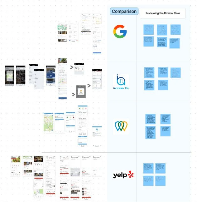 User Interviews and Competitor Analysis were the used in primary research. User interviews were essential to empathize with wheelchair users, and hear about the experiences, desires, and pain points of the mobility impaired. Analyzing primary and secondary competitors revealed the market opportunities for Roll as well as new ideas for location review flows.