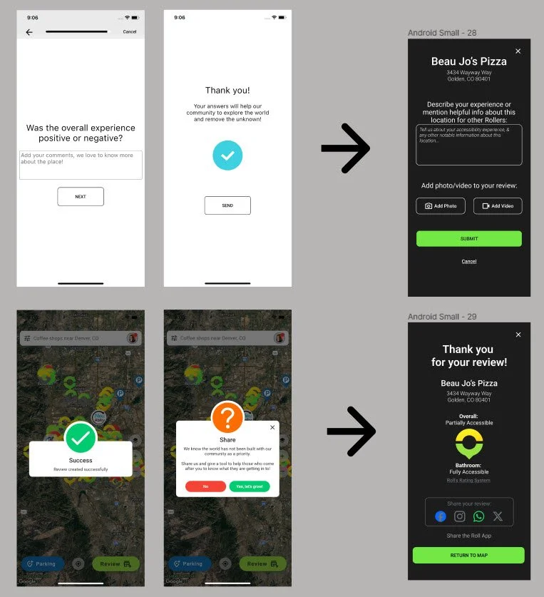 Include a review confirmation upon review completion where users can 1. share the review and 2. see the impact of their review on a business’ accessibility rating